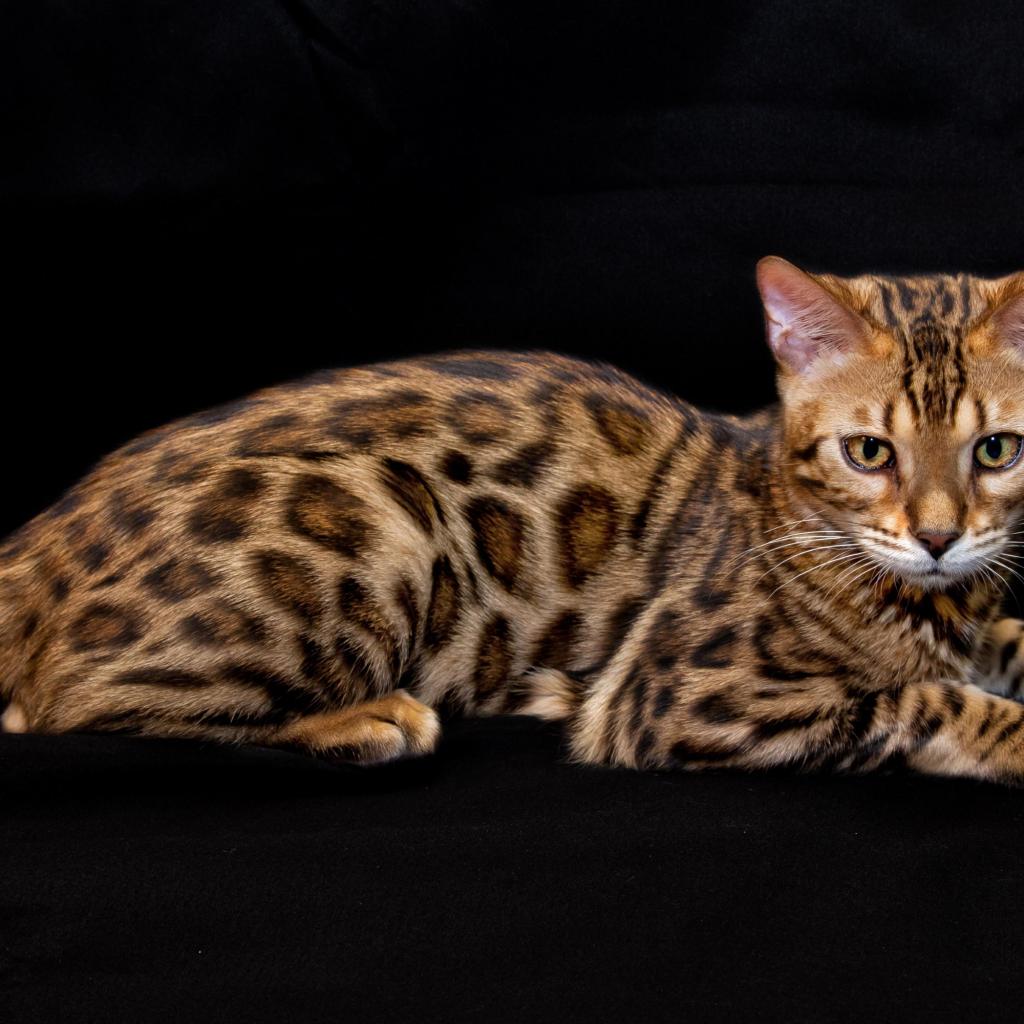 Wallpaper Bengal cat lies on a black background