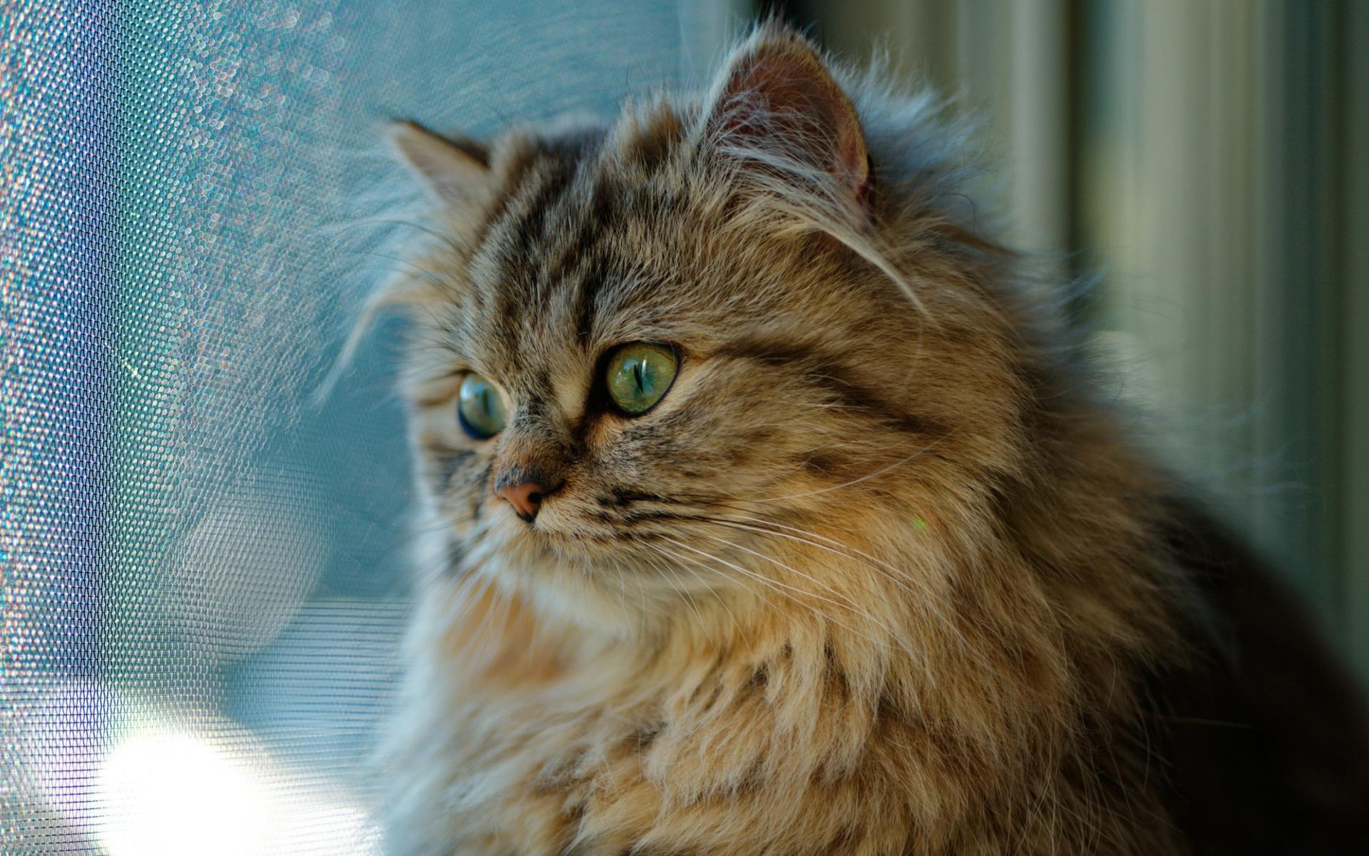 Wallpaper Beautiful fluffy green-eyed cat looking out the window