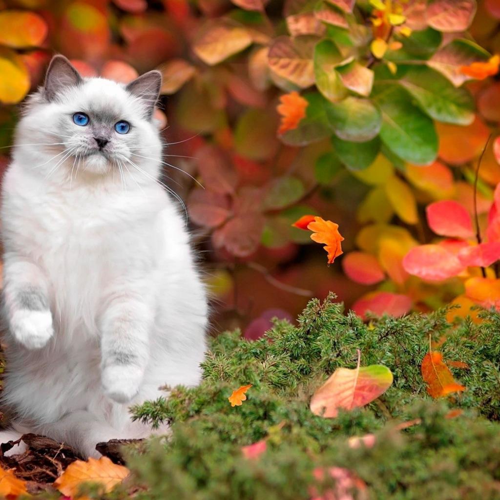 Wallpaper Beautiful blue-eyed fluffy cat in autumn