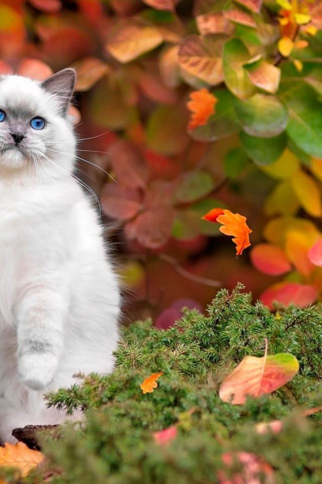 Wallpaper Beautiful blue-eyed fluffy cat in autumn