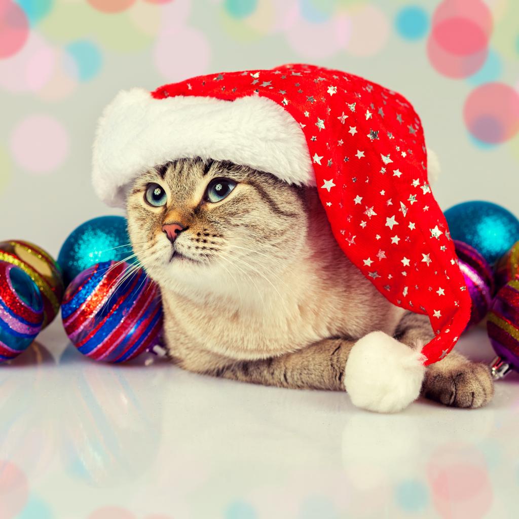 Wallpaper Funny cat in Christmas hat with Christmas balls