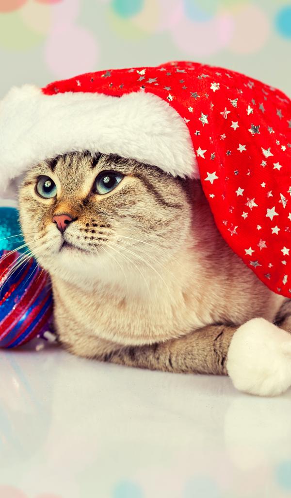 Wallpaper Funny cat in Christmas hat with Christmas balls