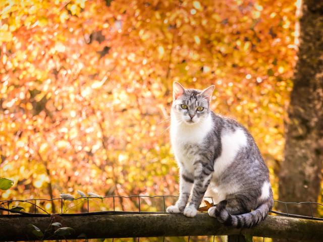 Wallpaper Cat sitting on a fence in the background of yellow trees