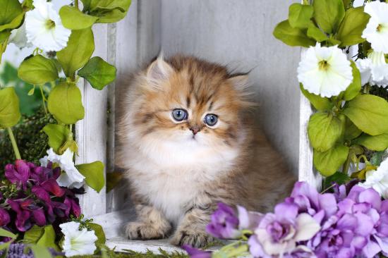 Wallpaper Cute fluffy gray kitten with big eyes in flowers