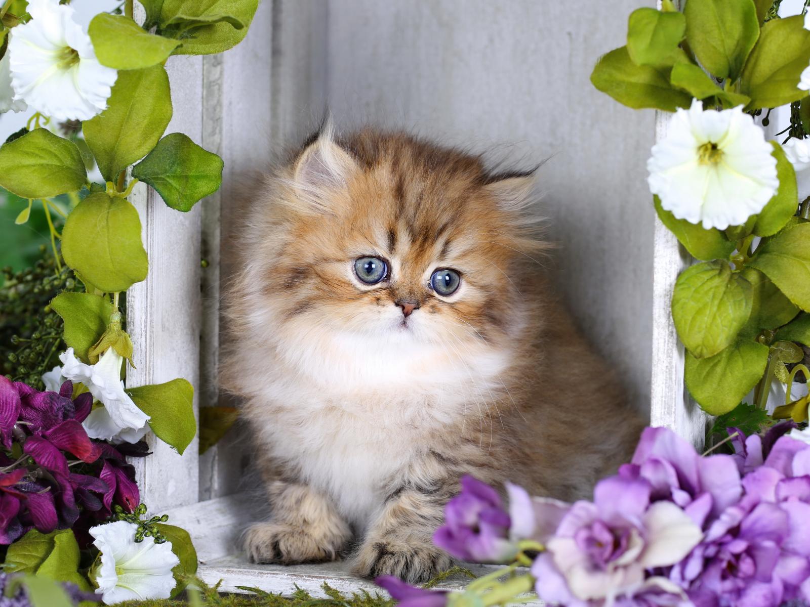 Wallpaper Cute fluffy gray kitten with big eyes in flowers