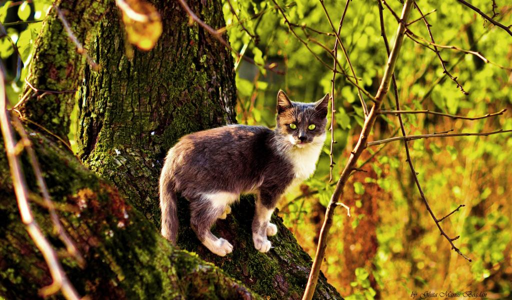 Wallpaper Three-color cat on a tree in autumn