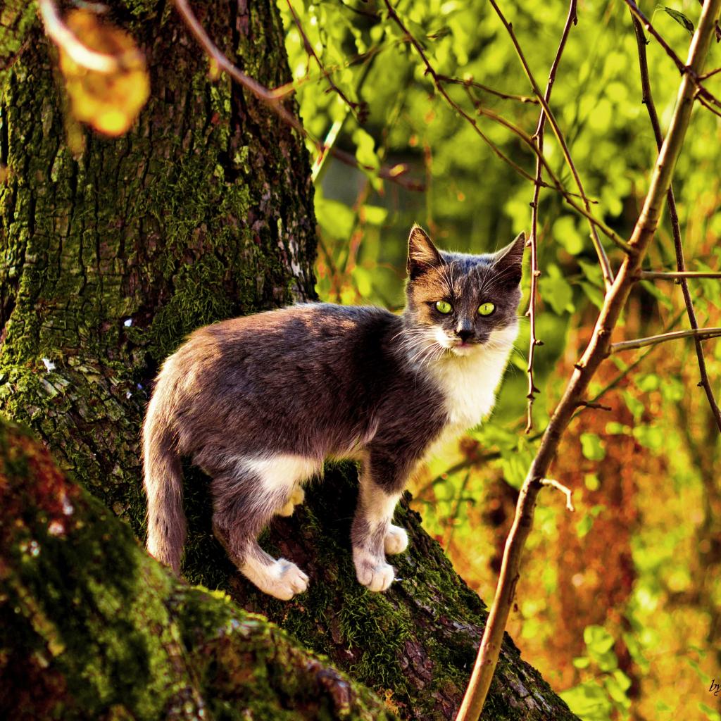Wallpaper Three-color cat on a tree in autumn