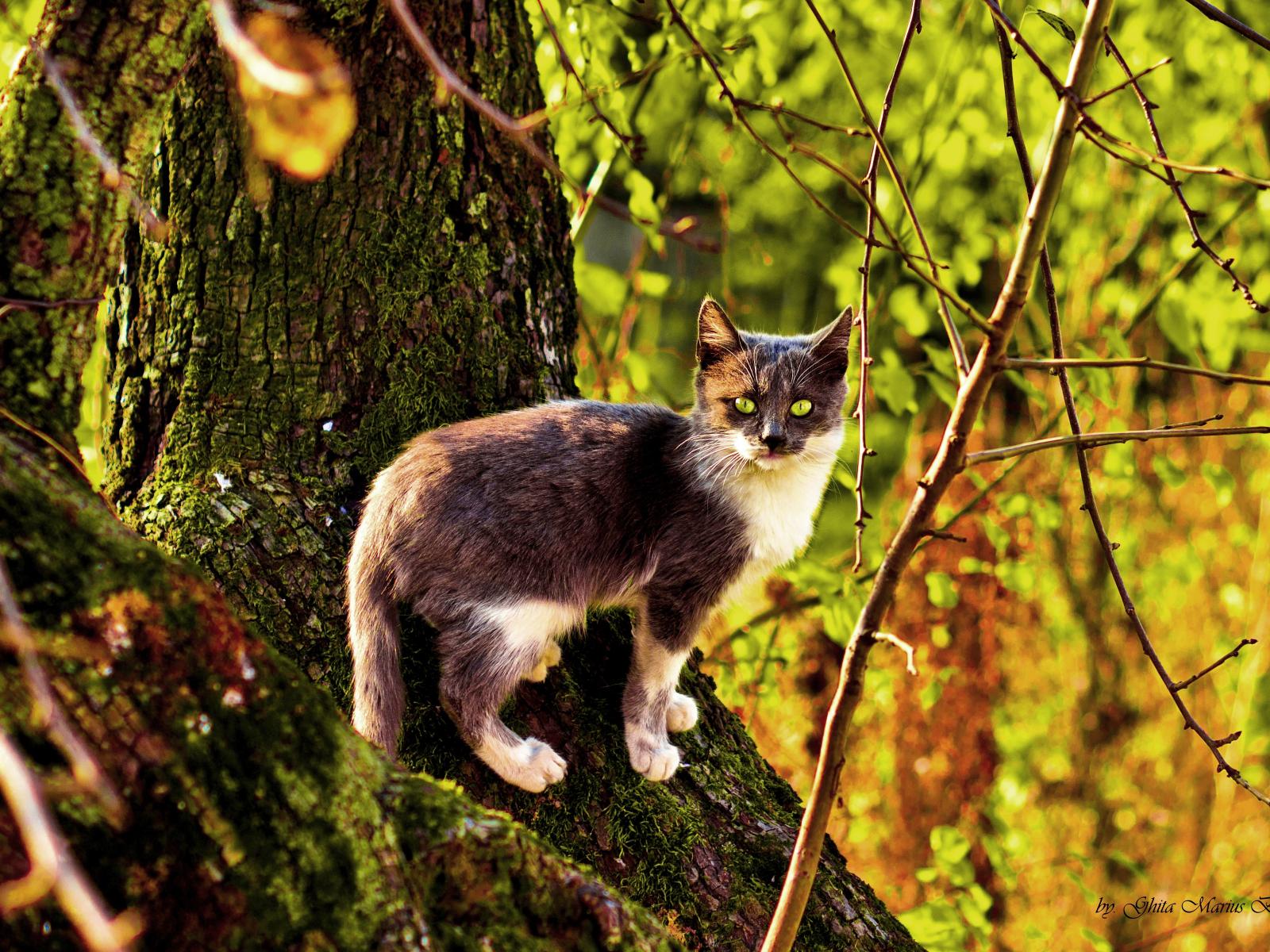 Wallpaper Three-color cat on a tree in autumn