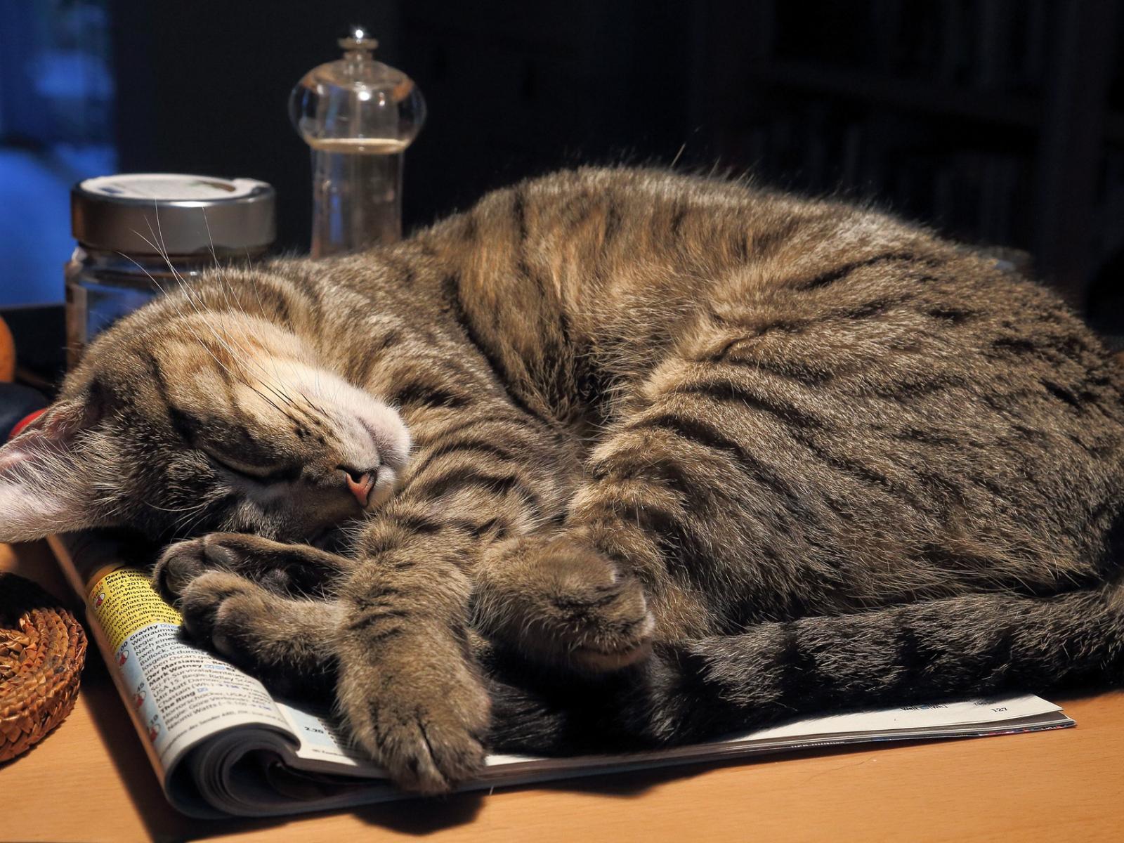 Wallpaper Gray cat sleeping on a table on a log