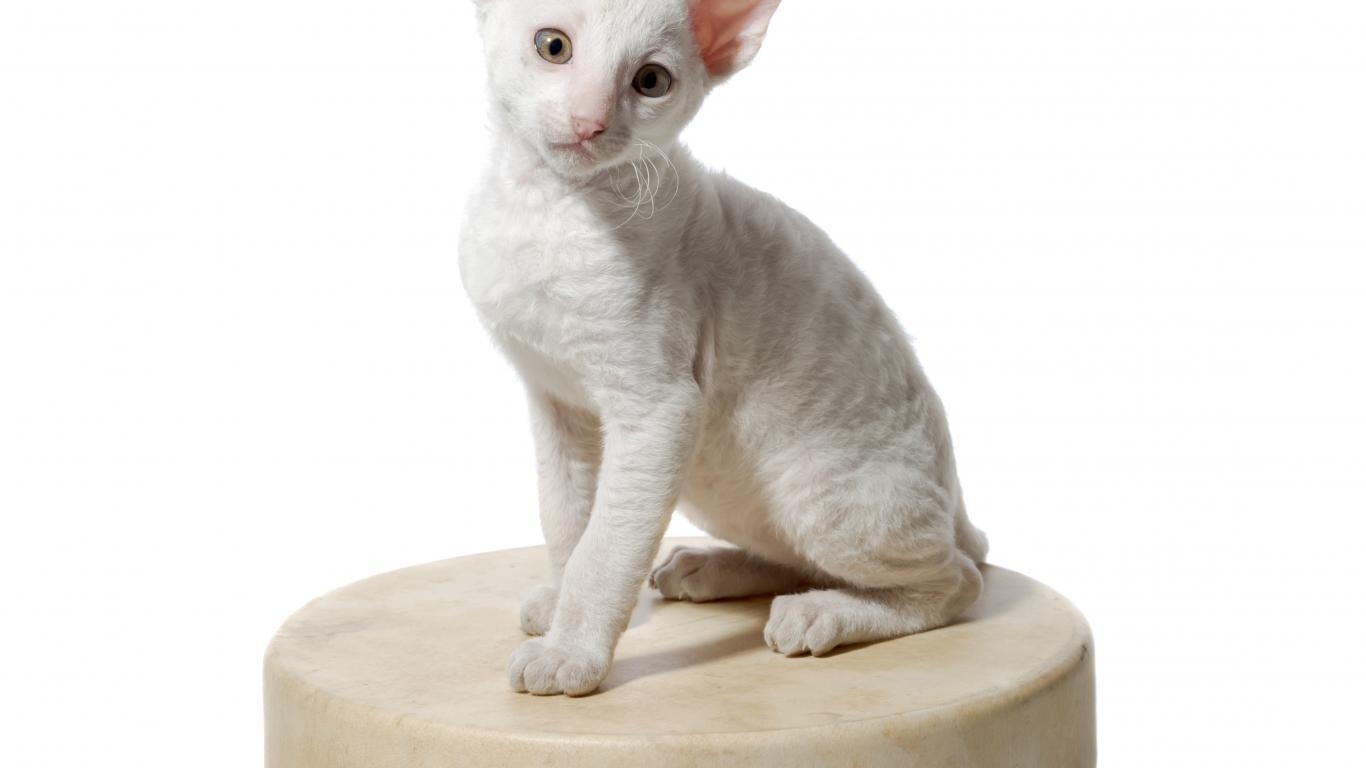 » Wallpaper White Kitten Cornish Rex sits on a round cushion