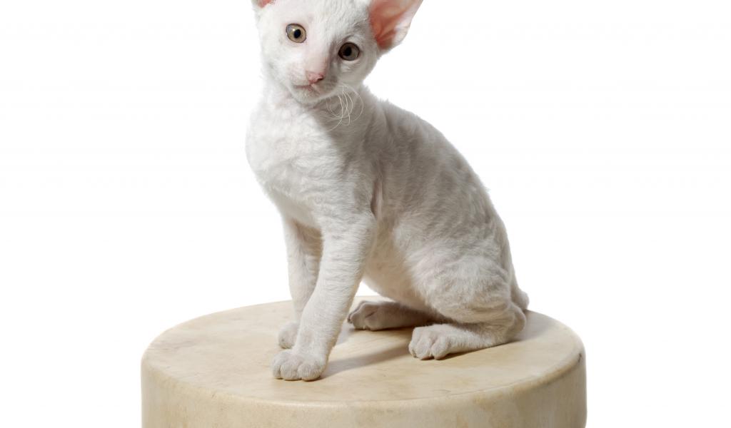 » Wallpaper White Kitten Cornish Rex sits on a round cushion