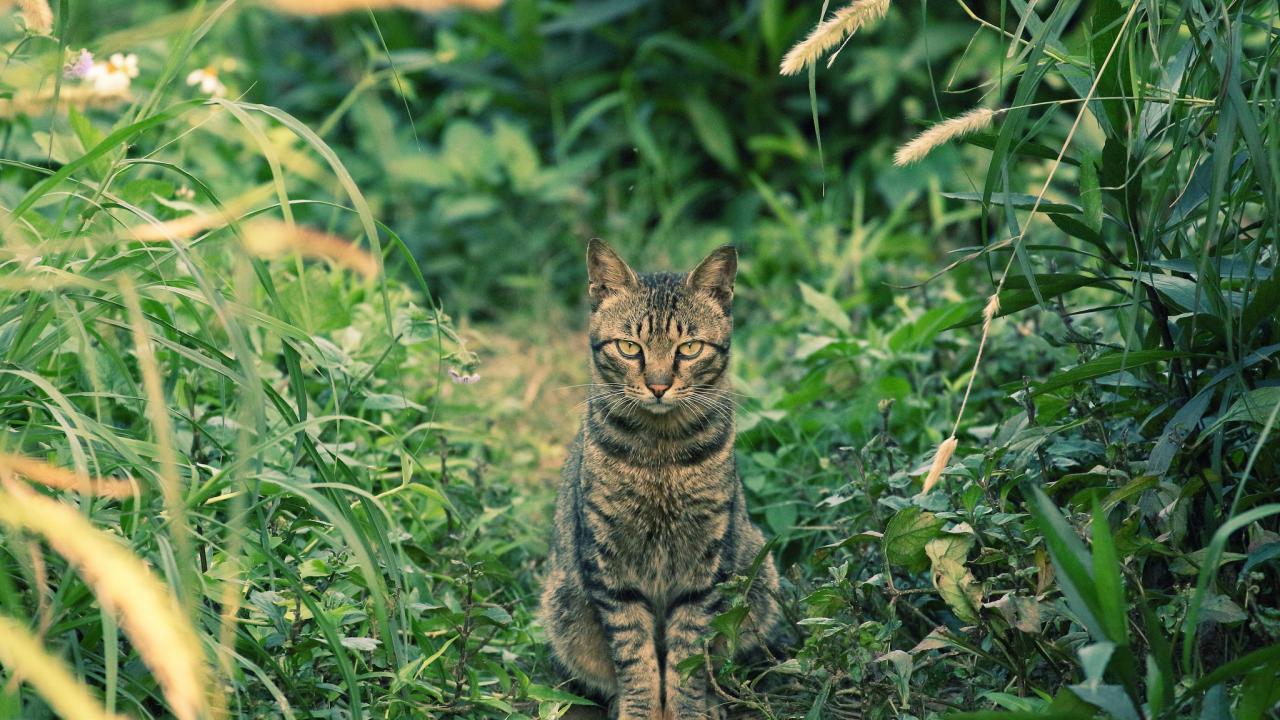 Wallpaper Gray cat sitting on a path in green grass