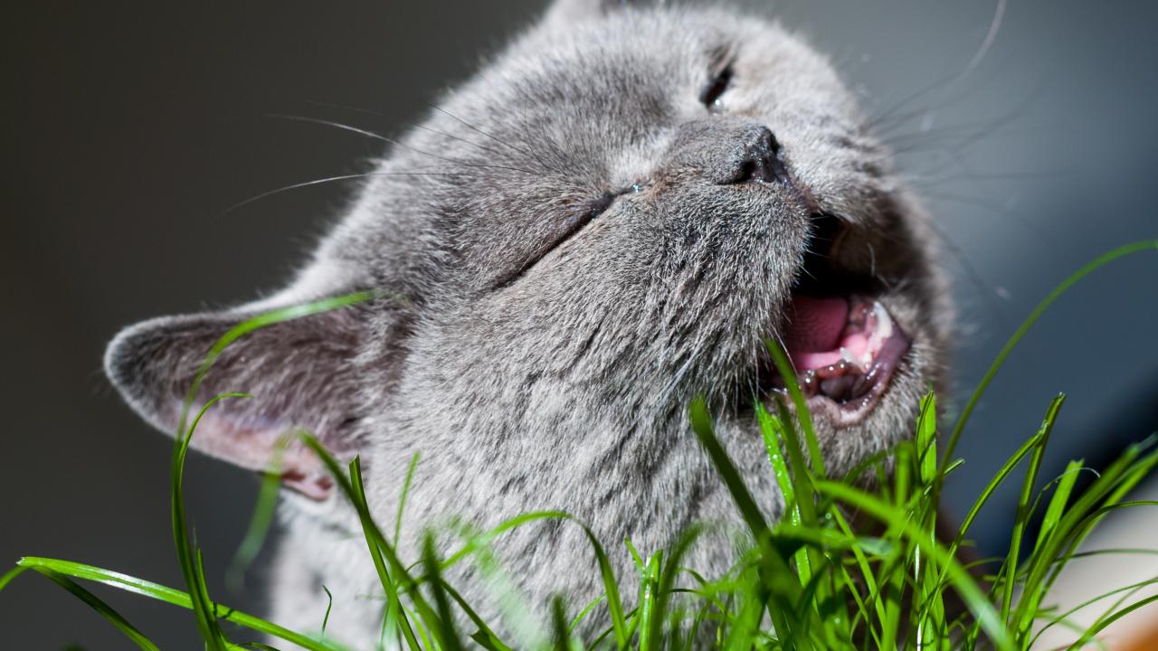 Wallpaper Gray cat Briton eating green grass