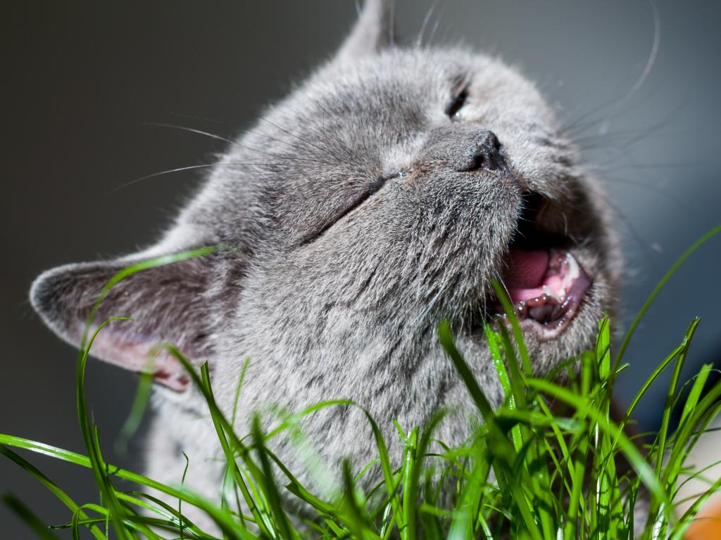 Wallpaper Gray cat Briton eating green grass