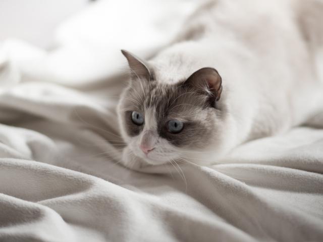 Wallpaper A beautiful thoroughbred blue-eyed cat lies on a white blanket