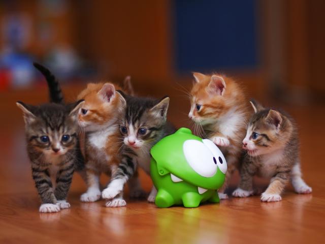 Wallpaper Little funny kittens with a green toy