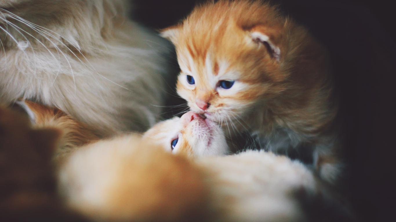 Wallpaper Three little cute kittens under the Christmas hat on a white background