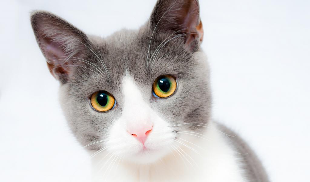 Wallpaper Head of gray with a white cat with yellow eyes