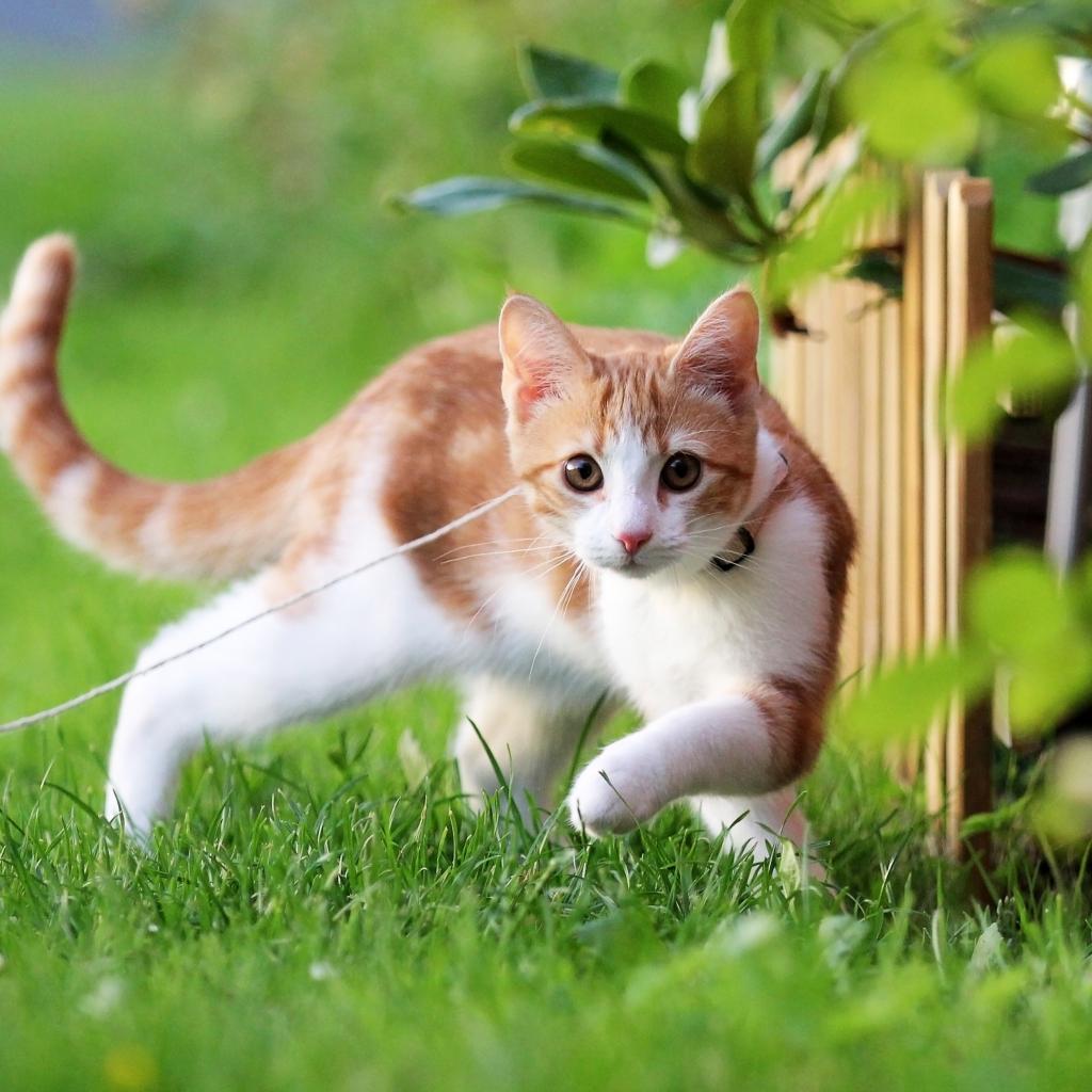 Wallpaper A small kitten on a leash walks along the green grass