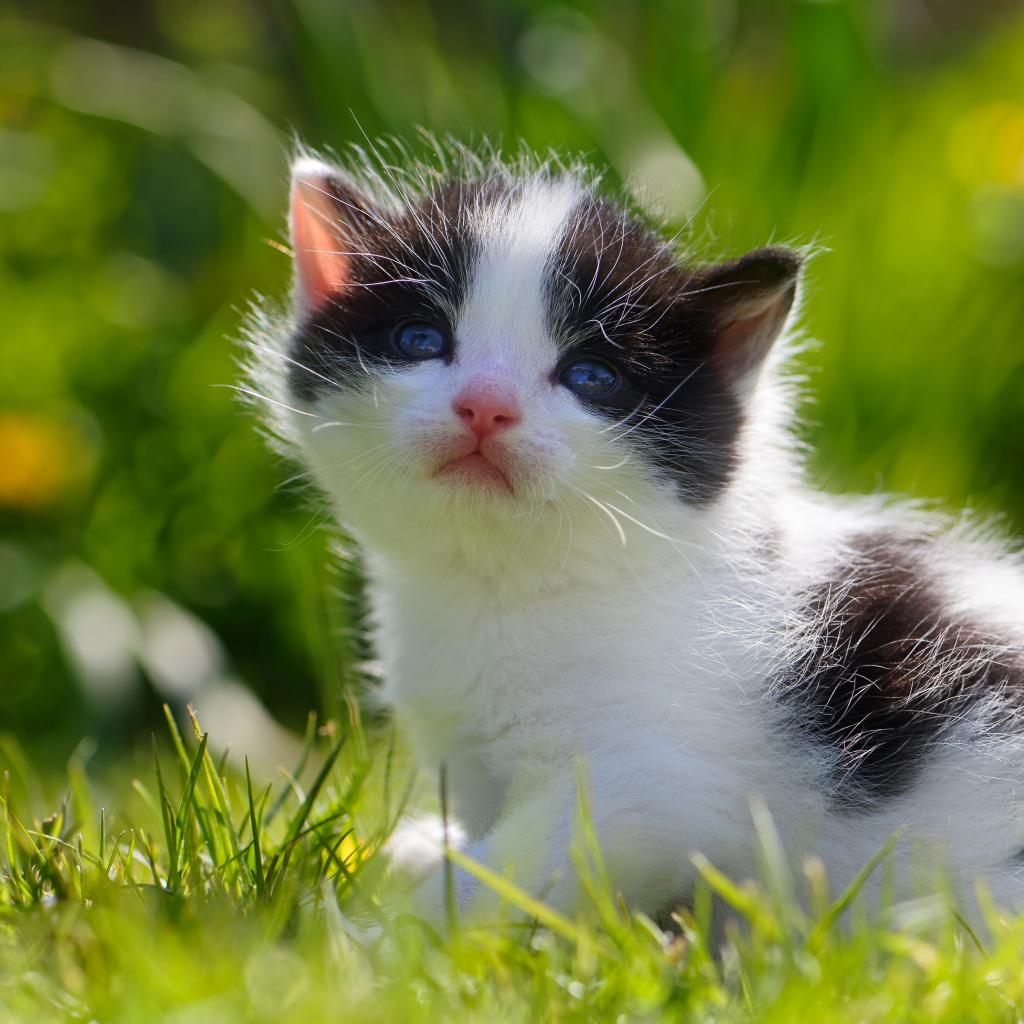Wallpaper Small black and white kitten sitting in green grass