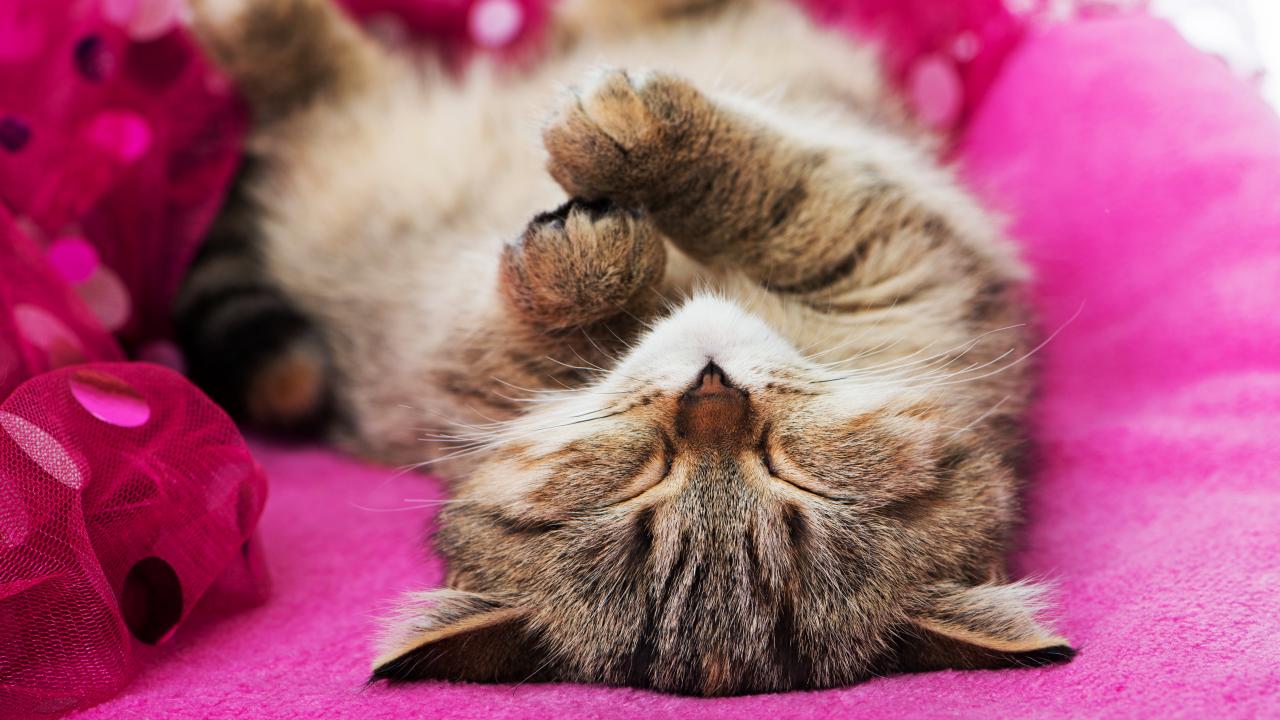 Wallpaper A cute gray kitten is sleeping on a pink blanket