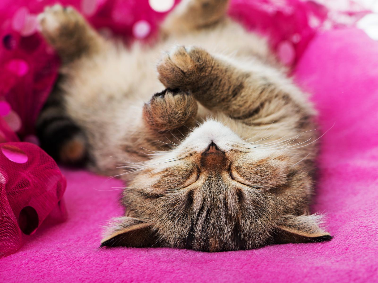 Wallpaper A cute gray kitten is sleeping on a pink blanket