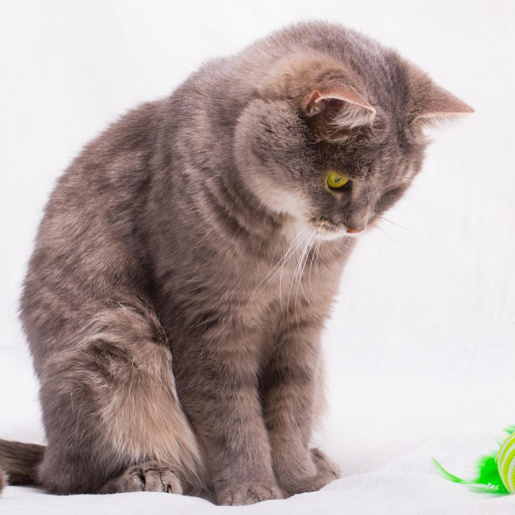 Wallpaper A cat looks at a toy on a rope on a gray background