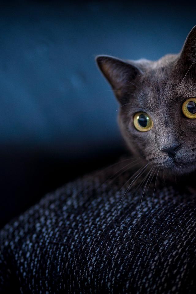 Wallpaper A frightened cat with yellow eyes hiding on the couch