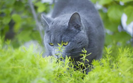 Wallpaper Gray cat Briton eating green grass