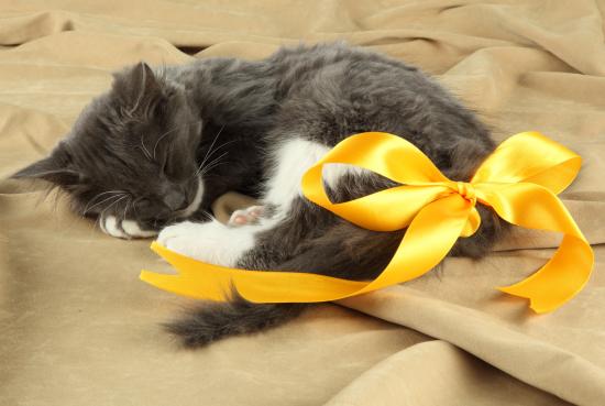 Wallpaper Little kitten with a bow of yellow ribbon on the tail