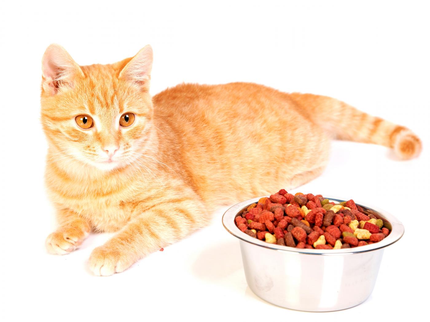 Wallpaper Red-haired kitten with a bowl of fodder on a white background