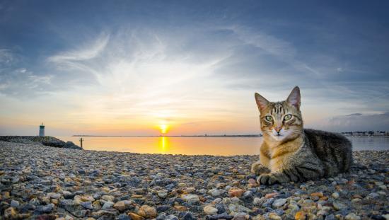 Wallpaper Gray cat lying on pebbles on the beach at sunset