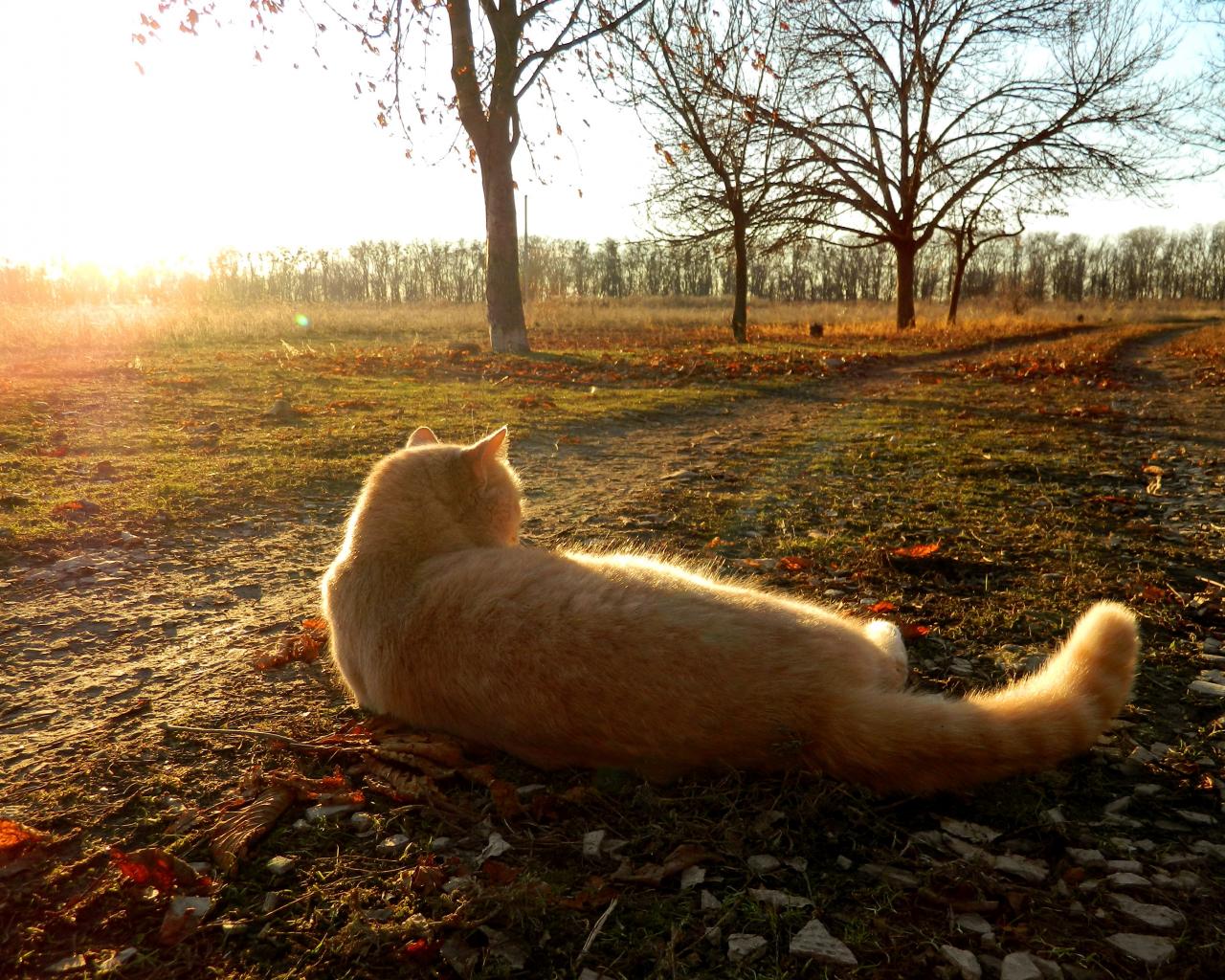 Wallpaper Red cat lying on the ground in the rays of the autumn sun