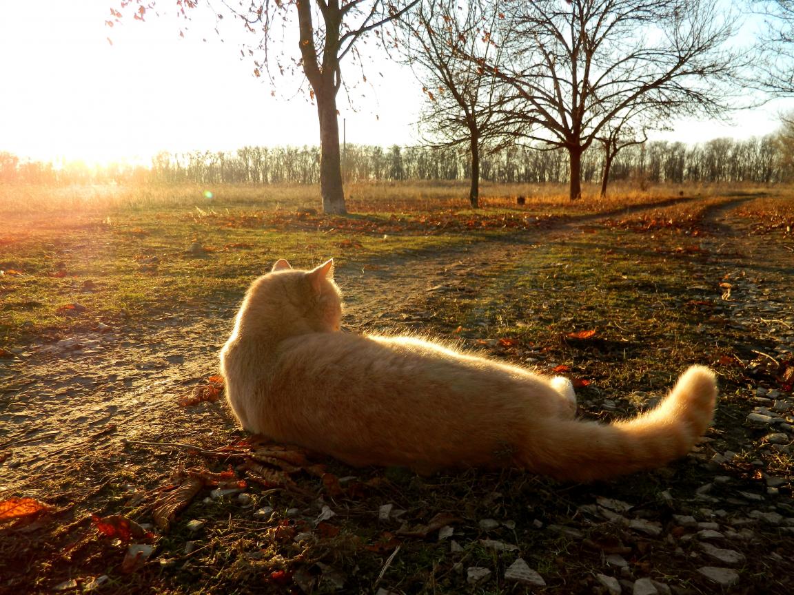 Wallpaper Red cat lying on the ground in the rays of the autumn sun