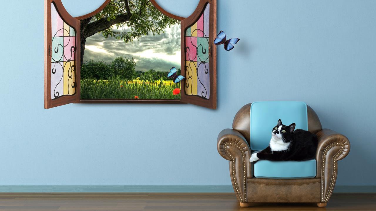 Wallpaper Black and white cat is lying on a chair by the window