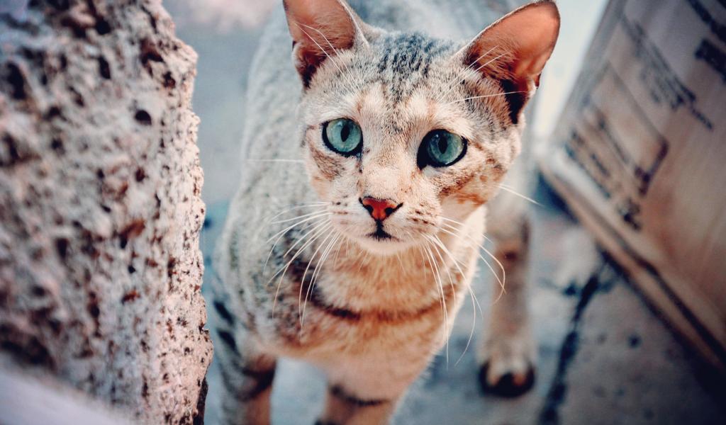 Wallpaper Green-eyed gray cat with his tongue out on a blue background