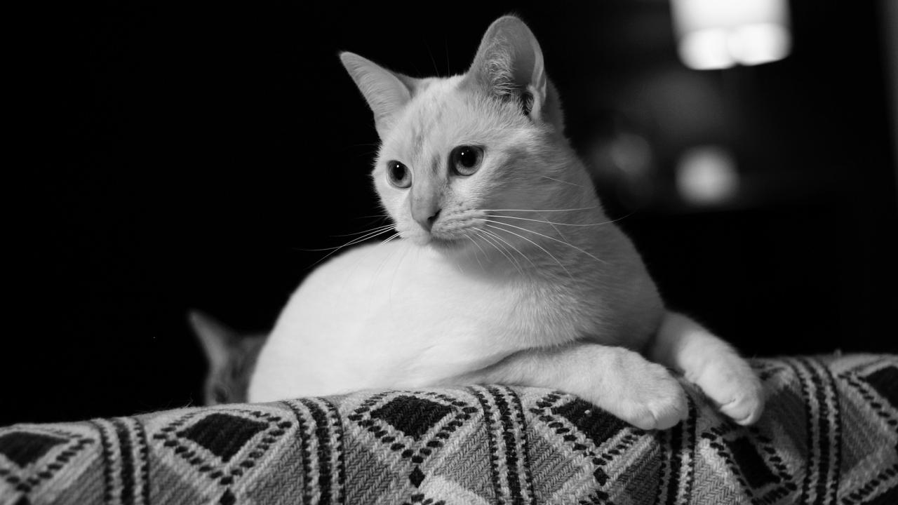 Wallpaper White cat lying on the couch black and white photo