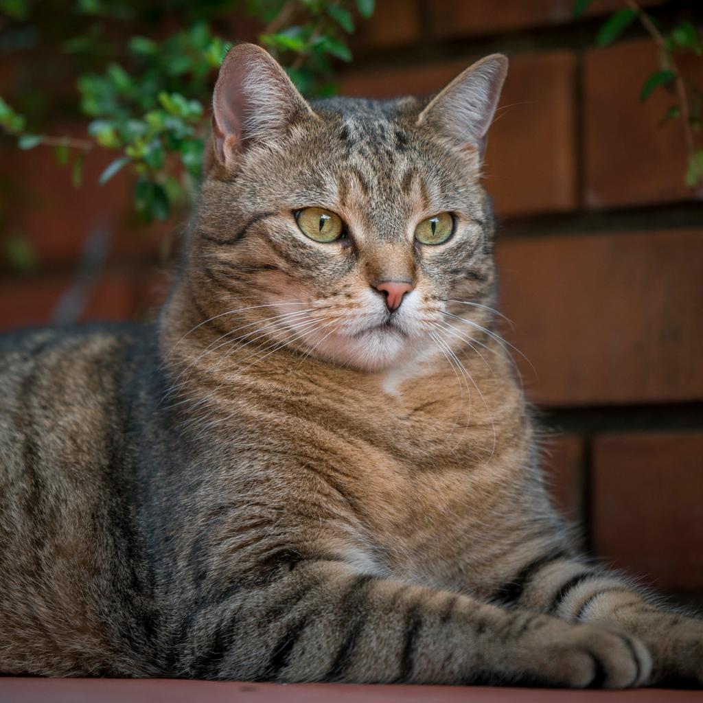 Wallpaper A large gray cat lies near a brick wall