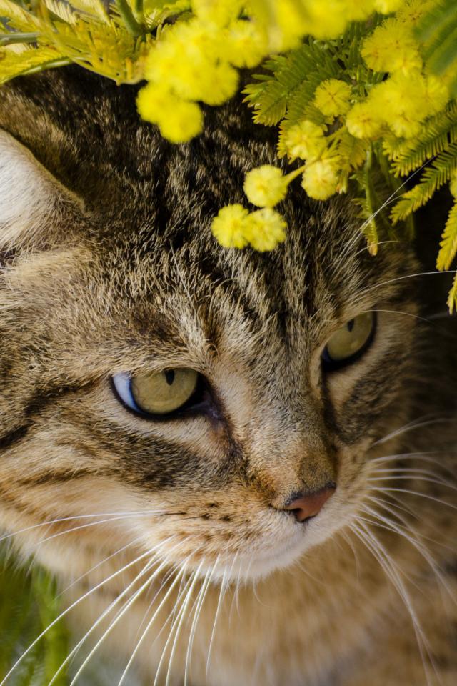 Wallpaper Gray cat in the branches of mimosa