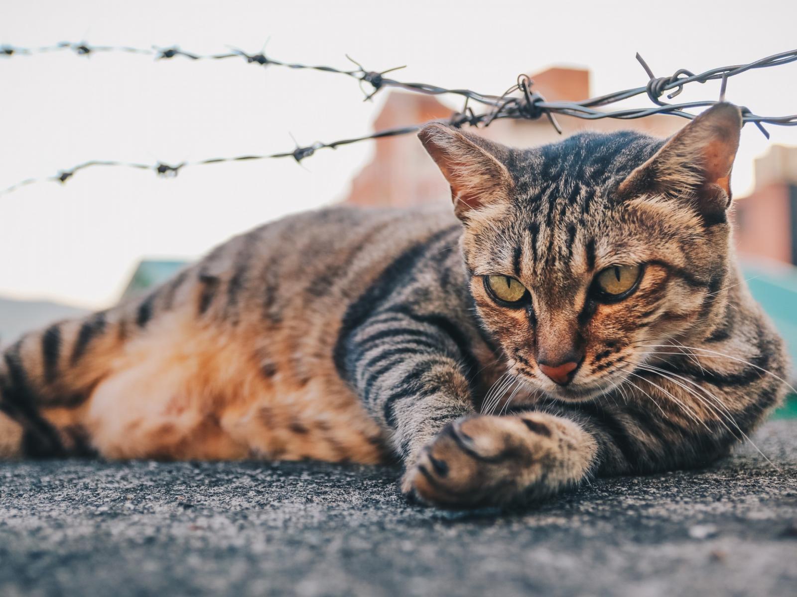 Wallpaper Gray cat lies under the barbed wire