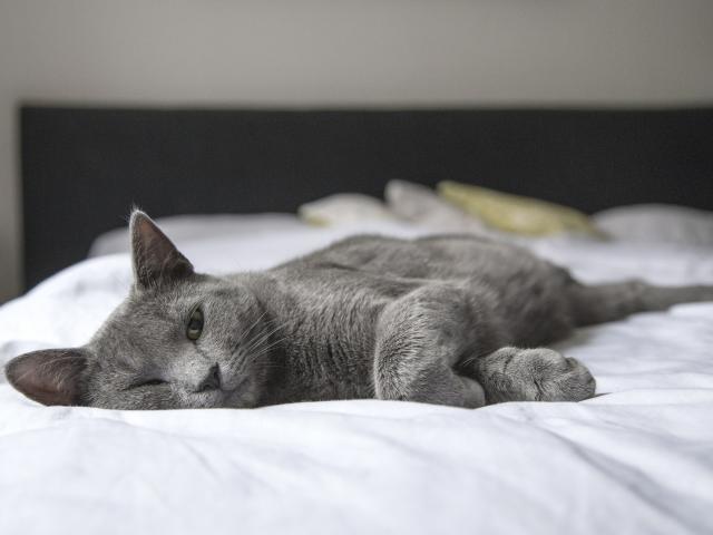 » Wallpaper Gray cat asleep on a white bed