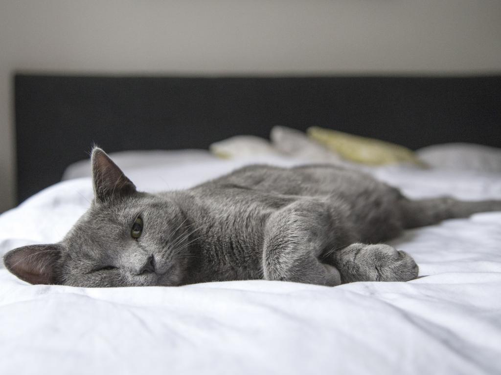 Wallpaper Gray cat asleep on a white bed
