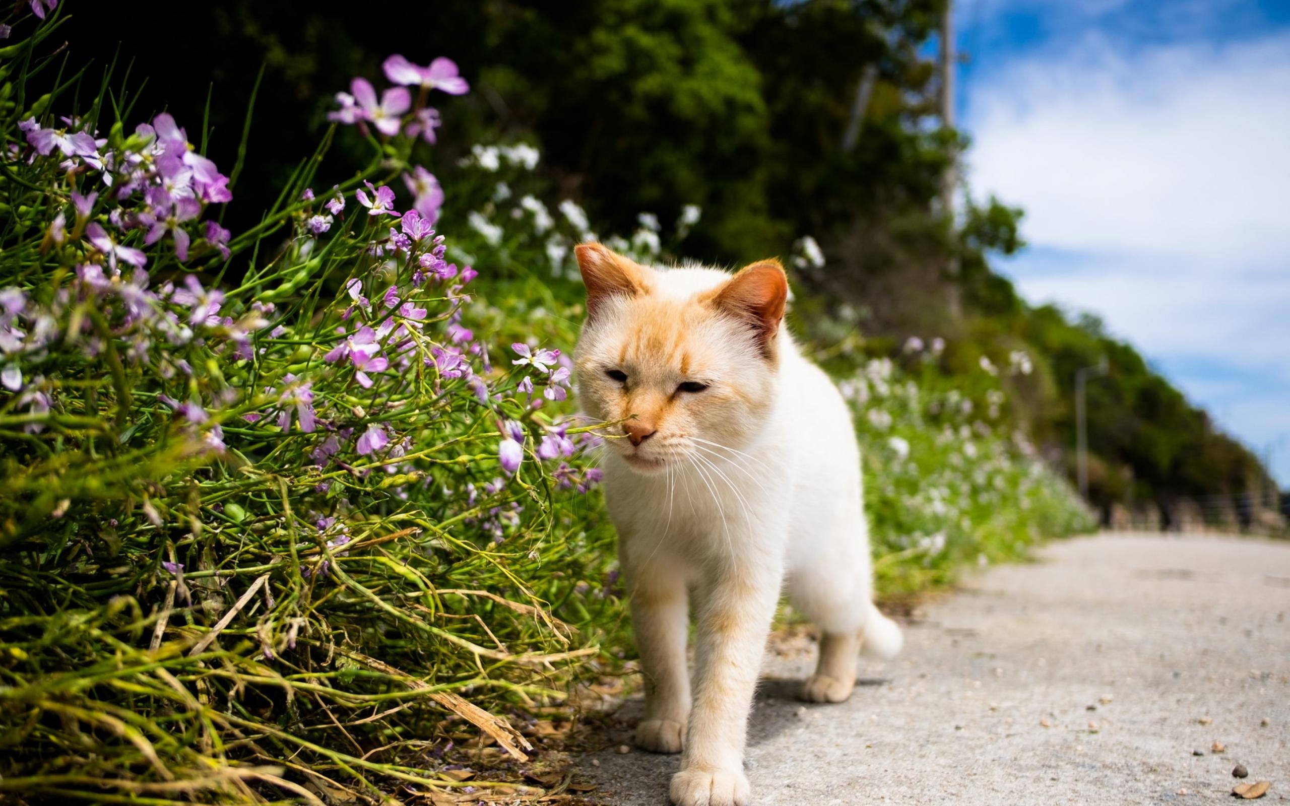 Wallpaper Red cat next to flowers near the road