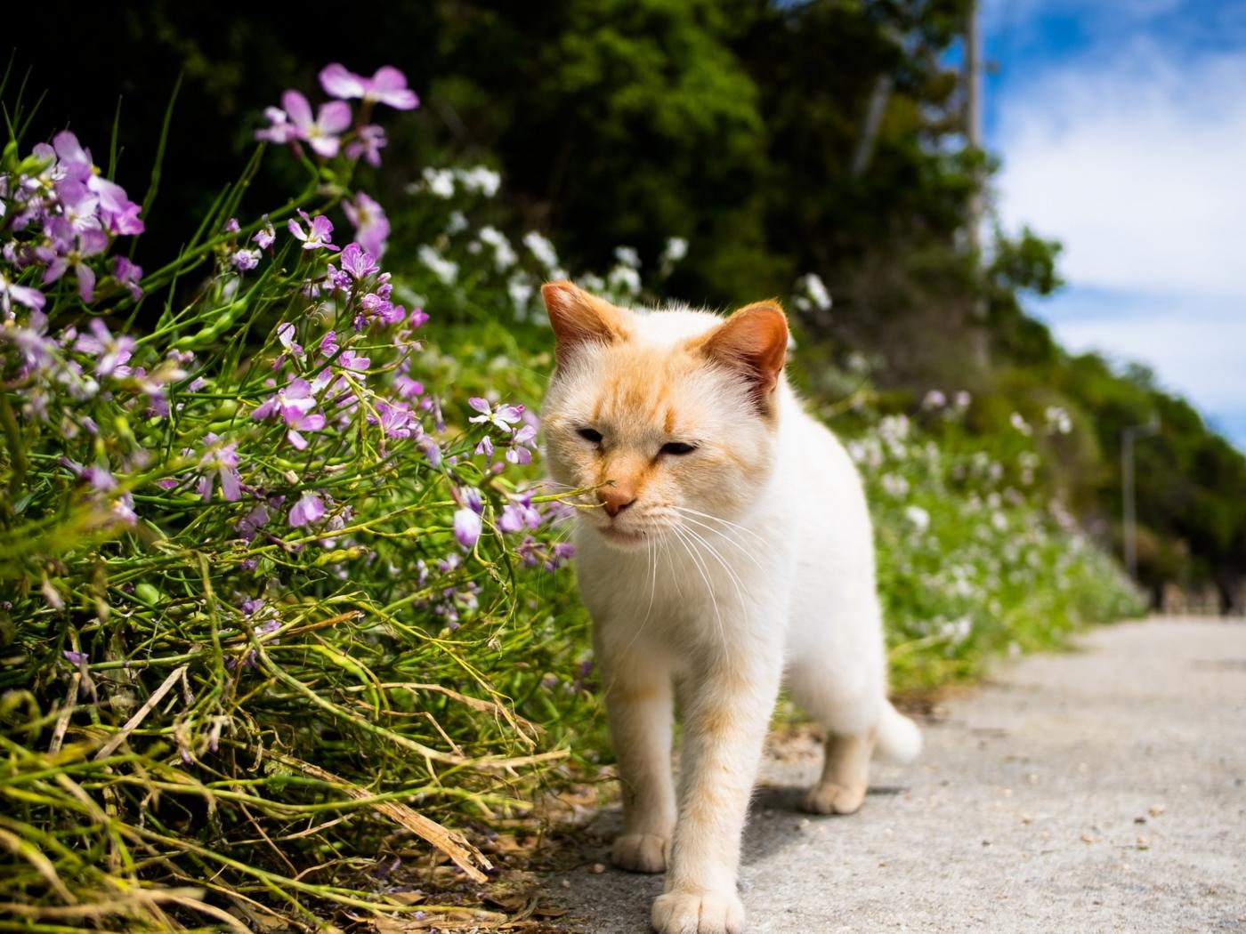 Wallpaper Red cat next to flowers near the road
