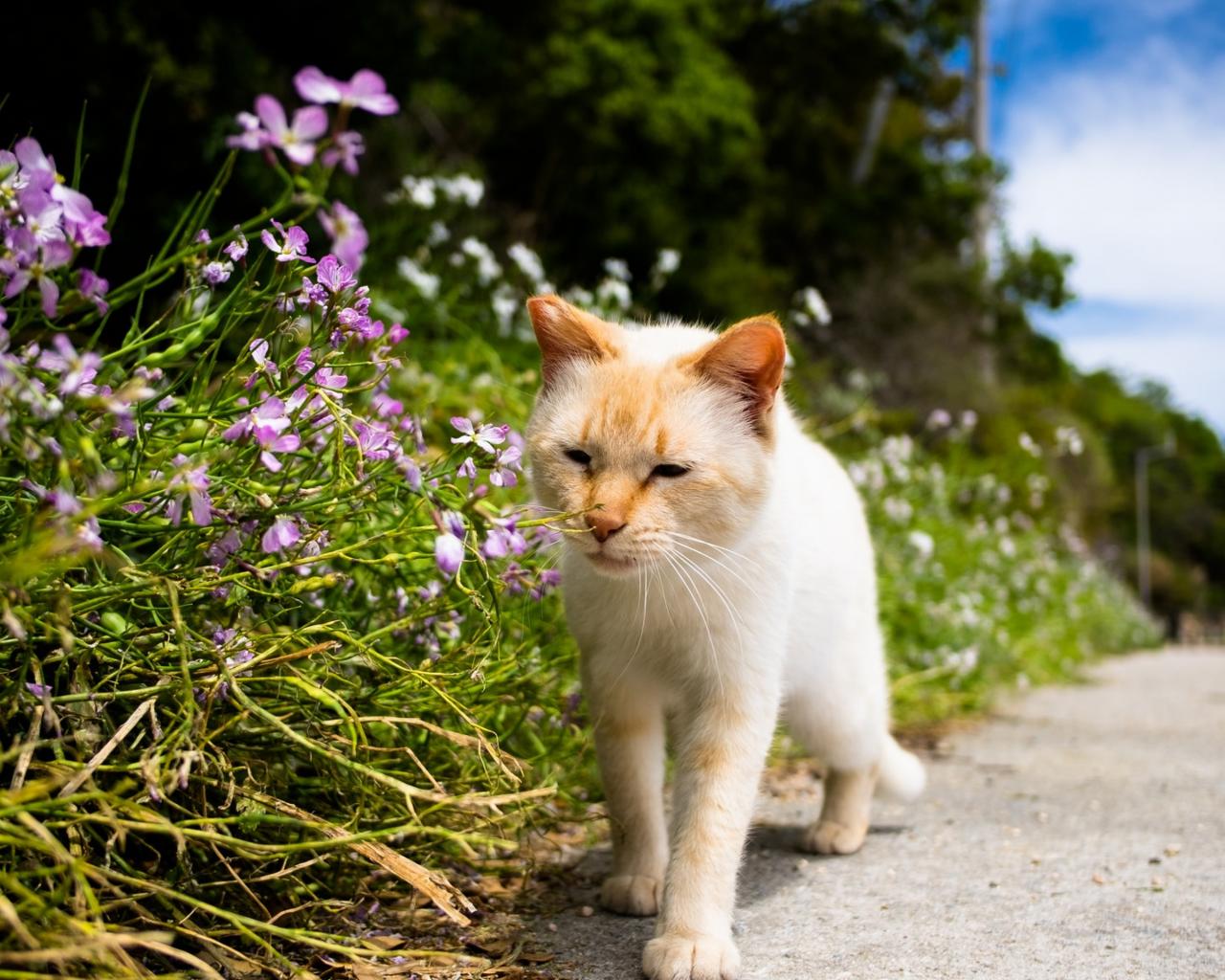 Wallpaper Red cat next to flowers near the road