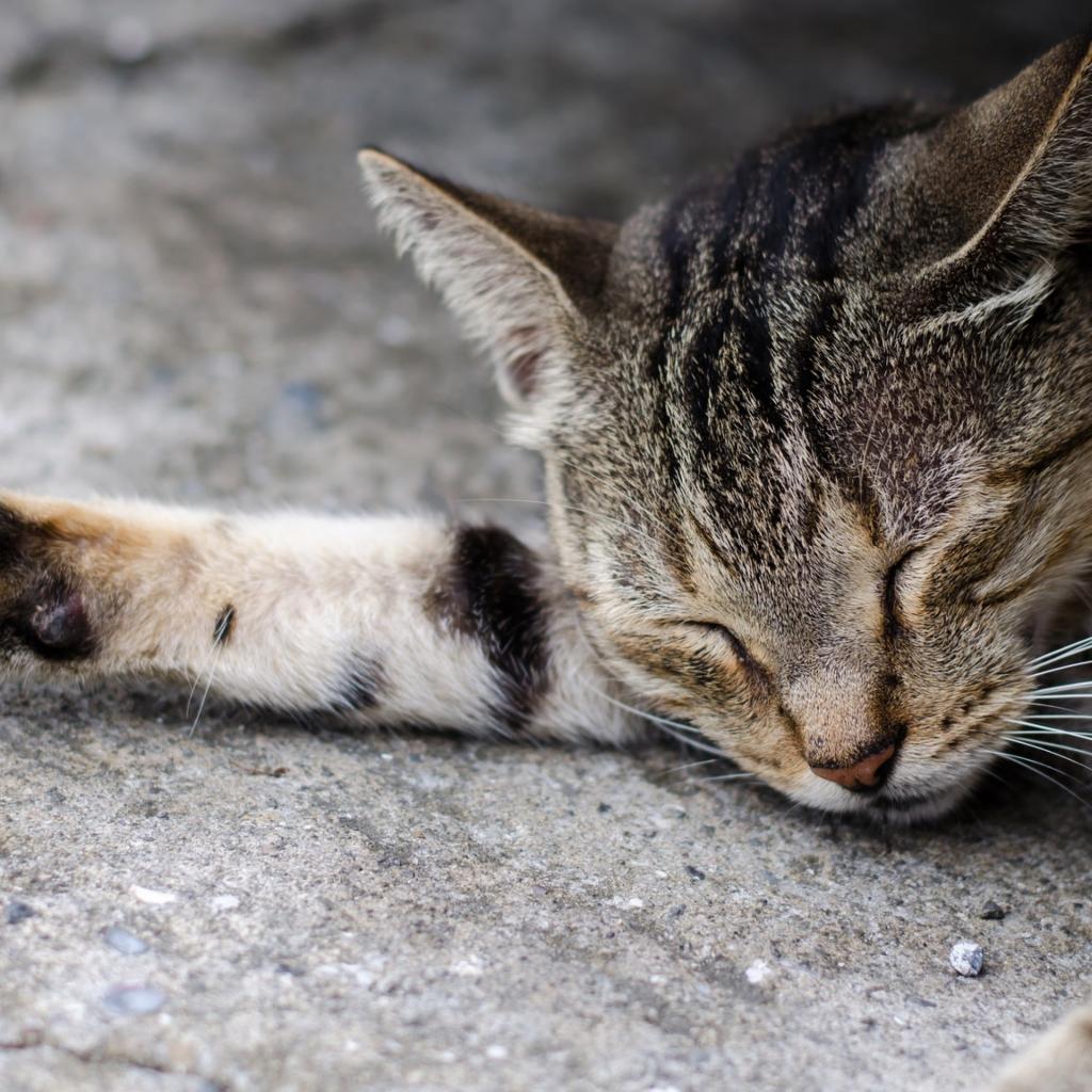 Wallpaper Gray cat sleeping on the asphalt