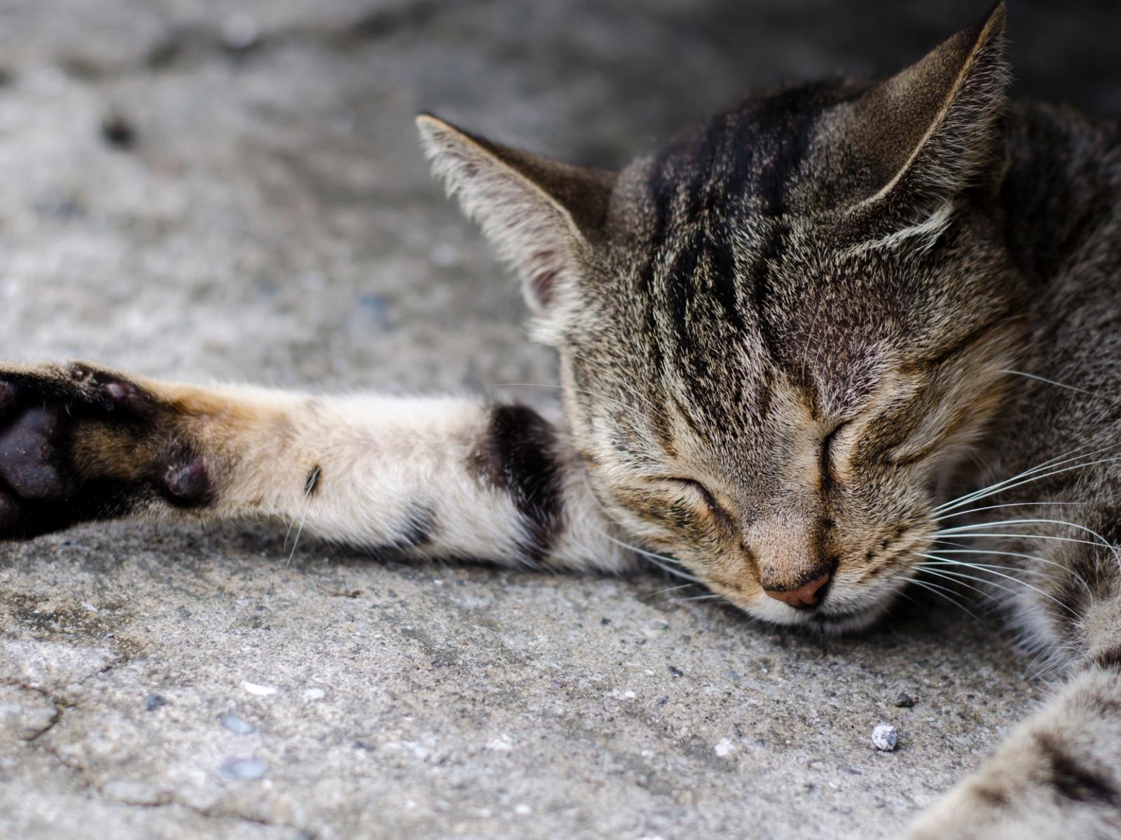 Wallpaper Gray cat sleeping on the asphalt