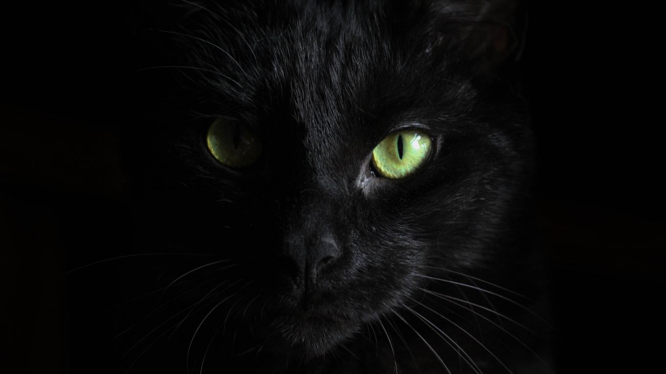 Wallpaper Head of a black green-eyed cat on a black background