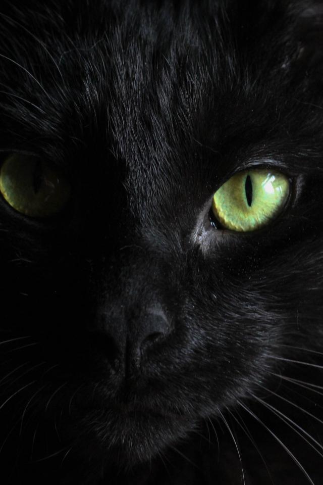Wallpaper Head of a black green-eyed cat on a black background