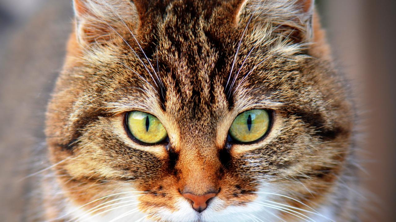 Wallpaper Muzzle of a gray tabby cat with green eyes